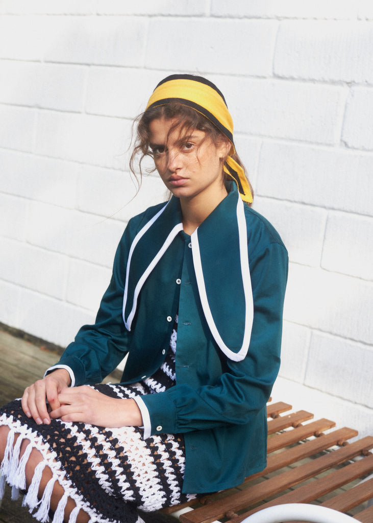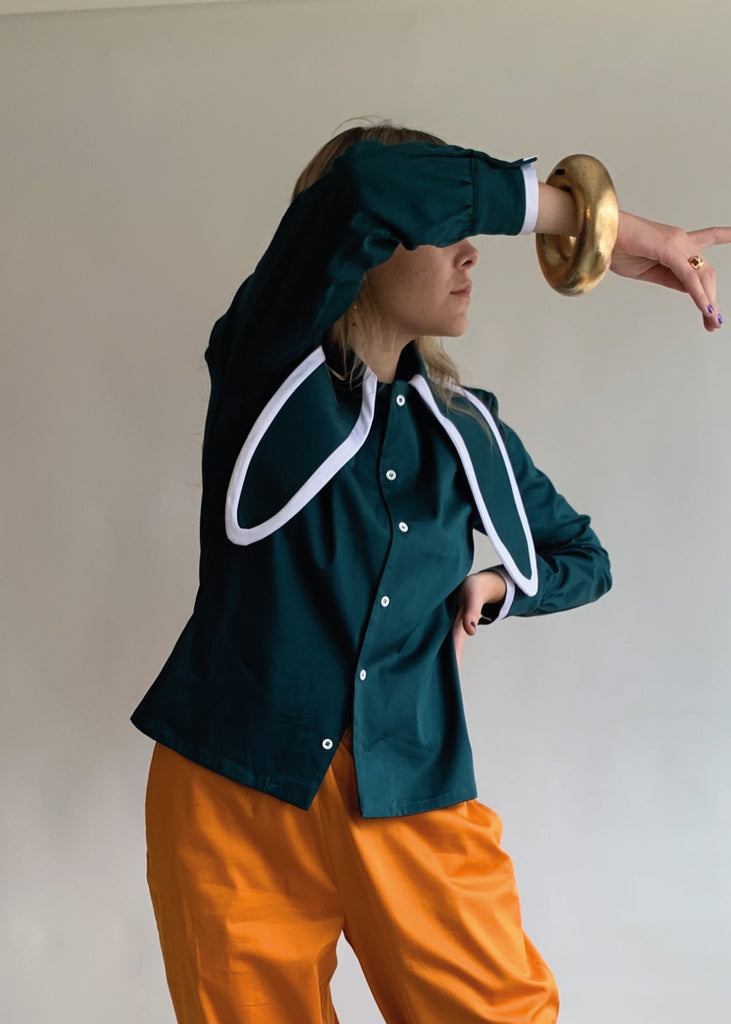 The Basset shirt got its name from our favourite dog breed; the basset hound. This shirt is defined by its big collar, slightly tailored waist and white contrasting details around collar and cuffs. A go to piece in your wardrobe for layering and multiple styling ways. Made from a soft cotton quality with a little shine the shirt features classic detailing such as button-up front and buttoned cuffs. Limited stock available.